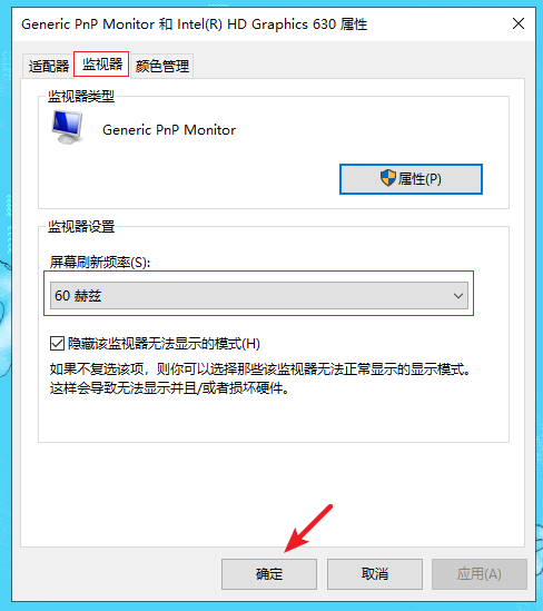 4.選擇監(jiān)視器,從中可以看到顯示器的刷新頻率設(shè)置為“60”,這正是造成顯示器屏幕不斷抖動(dòng)的原因。將新頻率設(shè)置為“75”以上,再點(diǎn)擊確定,有的只有60HZ,就選擇默認(rèn)的,然后點(diǎn)擊“確定”即可。