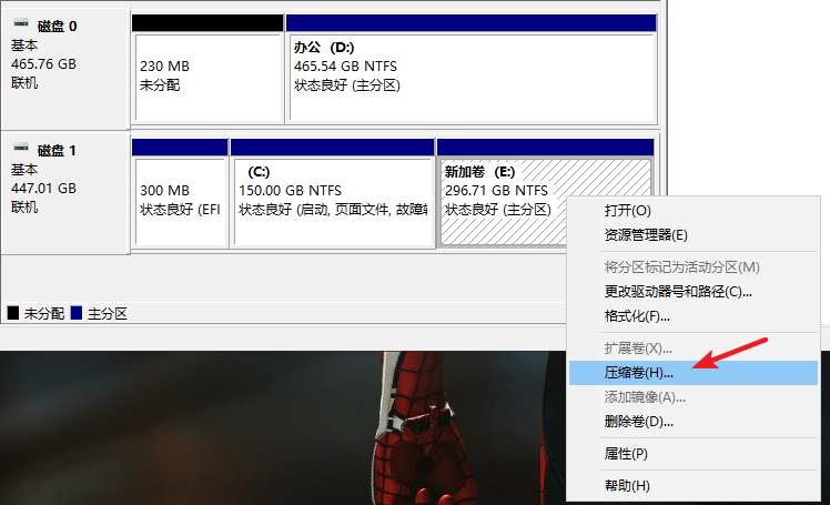 3. 鼠標右擊想要分區的磁盤,選擇“壓縮卷”