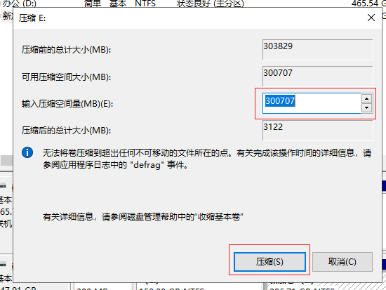 4.系統會自動查詢壓縮空間,彈出以下界面時在輸入壓縮空間量一欄輸入要壓縮的空間量,然后點擊“壓縮”按鈕