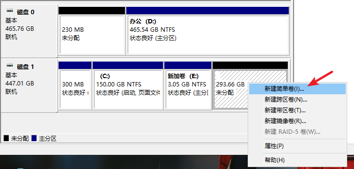 5. 完成后出現可用空間黑色區域,鼠標右擊該區域,選擇“新建簡單卷”