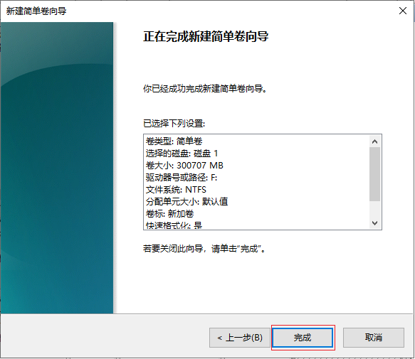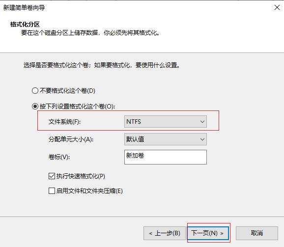 9. 點擊按下列設置格式化這個卷,將文件系統選為NTFS,然后點擊“下一步”,最后點擊“完成”即可
