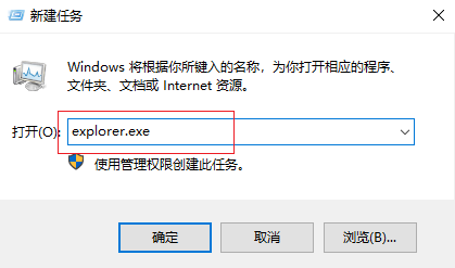 3. 打開新建任意運行界面,輸入explorer.exe,并按下回車。之后屏幕就可以正常顯示了。但還沒徹底解決問題