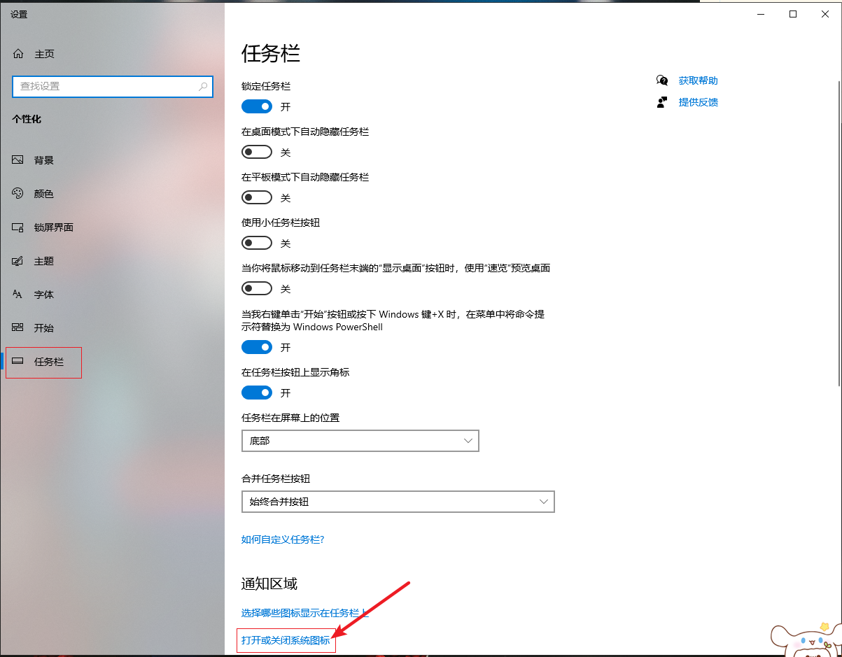 2.在彈出的界面左側(cè)選擇“任務(wù)欄”,右側(cè)點擊“打開或關(guān)閉系統(tǒng)圖標(biāo)”
