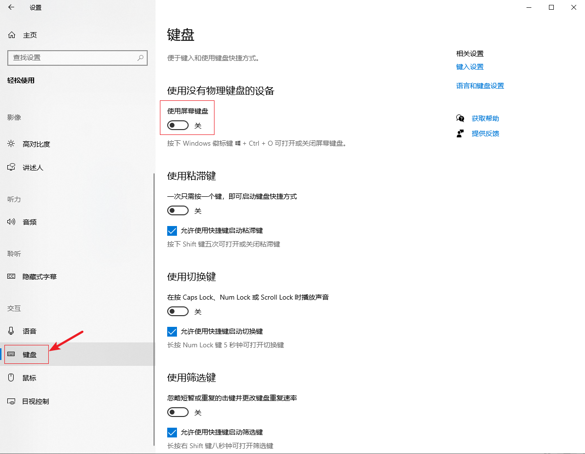 3.在左側下拉找到并點擊【鍵盤】,然后在右側打開【使用屏幕鍵盤】即可調出軟鍵盤使用了。