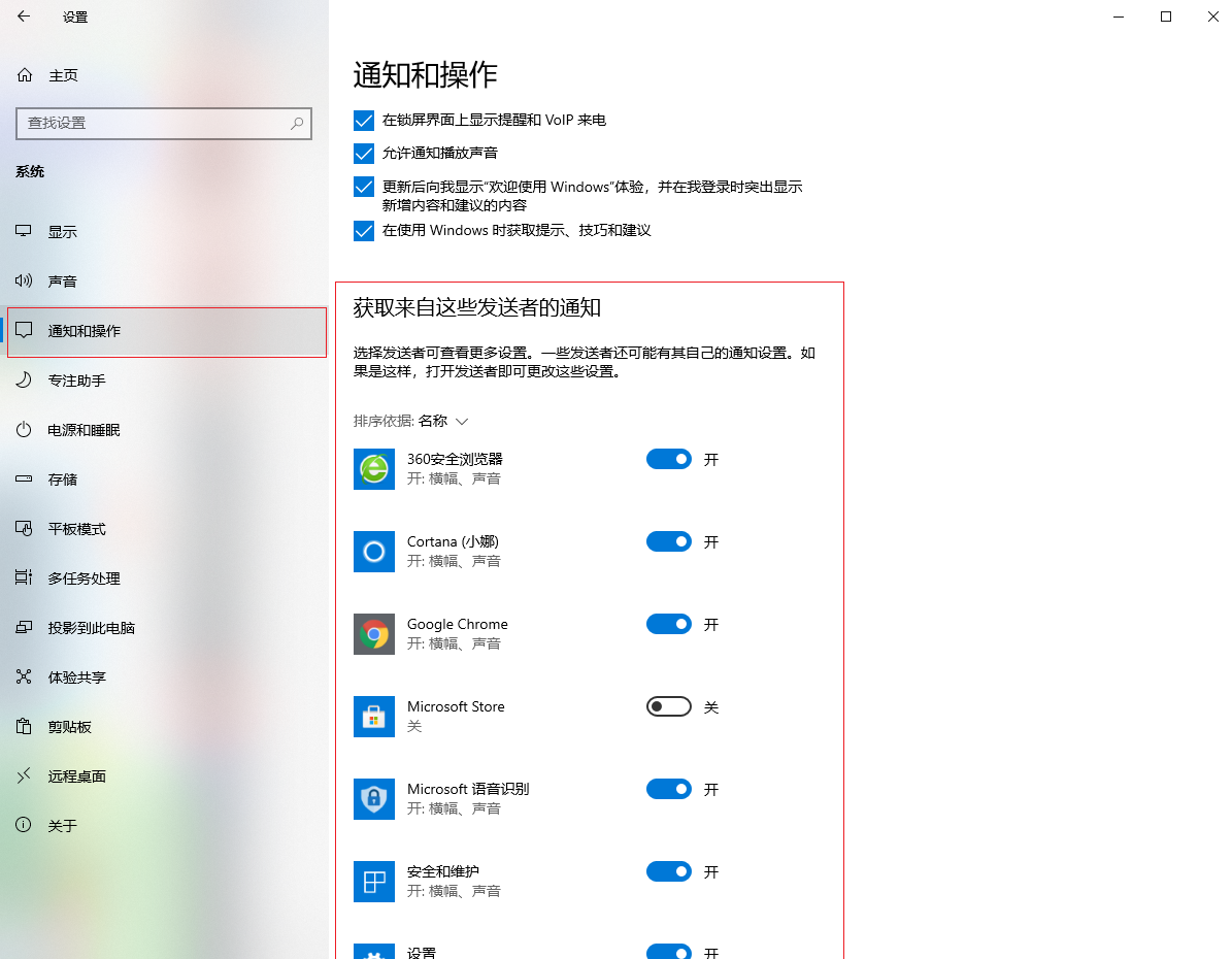 2.進(jìn)入設(shè)置界面,在左側(cè)選擇【通知和操作】,然后在右側(cè)下拉找到【獲取來(lái)自這些發(fā)送者的通知】,在它下面把通知的相應(yīng)圖標(biāo)關(guān)了就可以了。