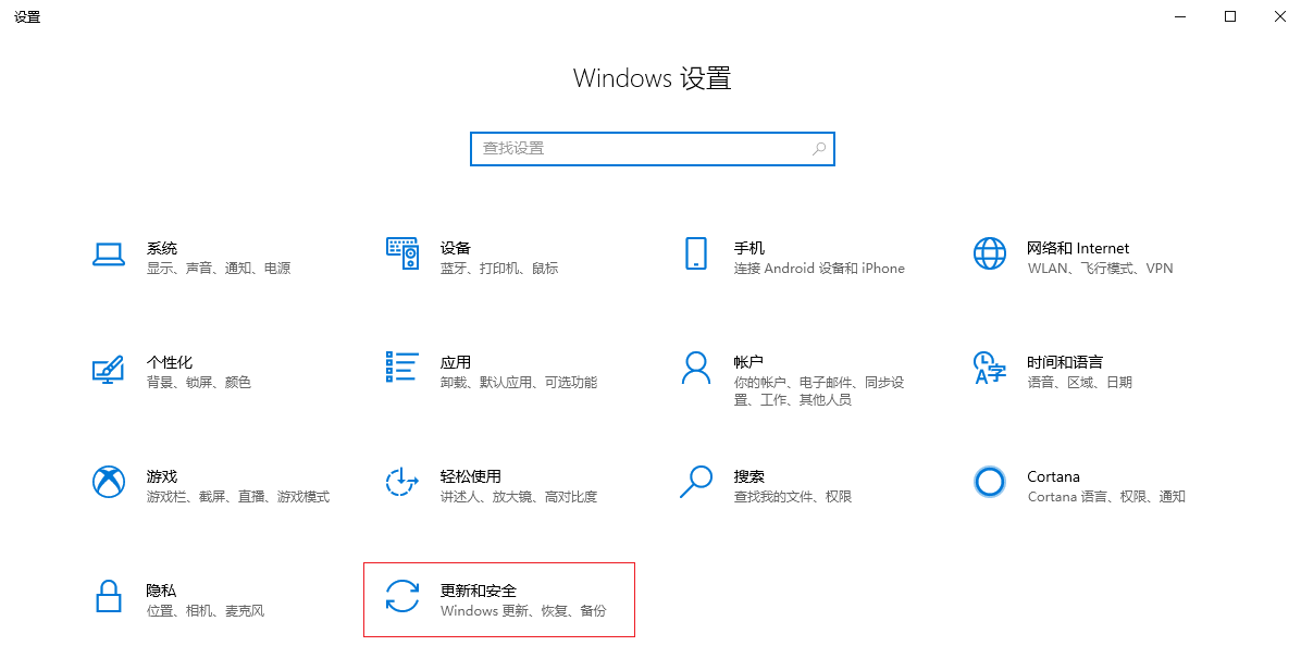 1.在鍵盤上按下【win+i】組合鍵,調出設置選項面板,然后選擇【更新和安全】進入。