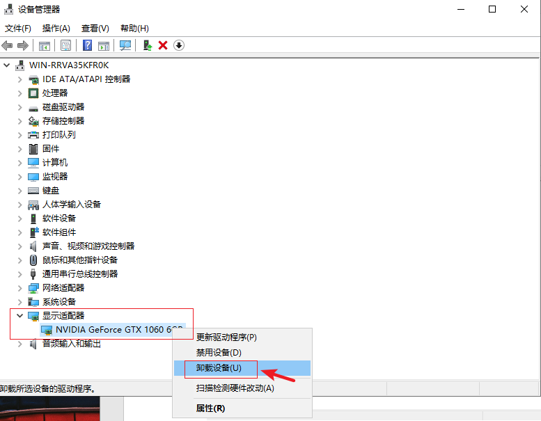 3.在設(shè)備管理器中找到【顯示配適器】,然后點(diǎn)開找到要卸載的顯卡驅(qū)動,鼠標(biāo)右擊選擇【卸載設(shè)備】。