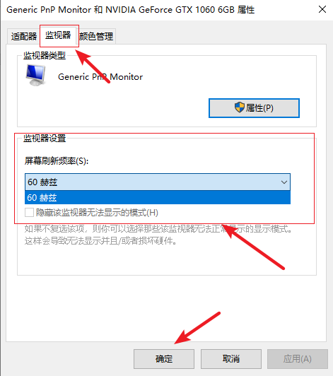 4.在屬性窗口上方選擇【監視器】,然后選擇屏幕刷新率的數值,最后點擊【確定】即可。
