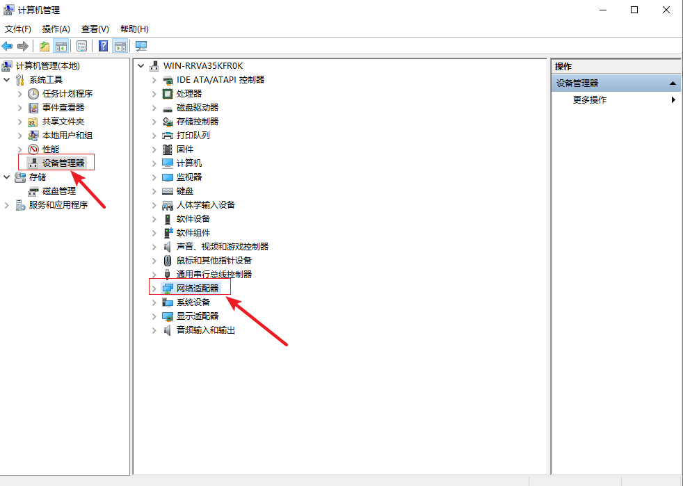 2.進入計算機管理界面,點擊【設備管理器】,然后在右側下拉找到【網絡適配器】。
