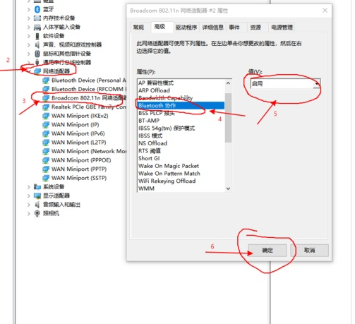 3.在網絡適配器子選項中下拉找到【Broadcom網絡適配器選項】打開,然后在彈出的界面中選擇【高級】,找到【Bluetooth】,然后將其選擇為【啟用】即可。