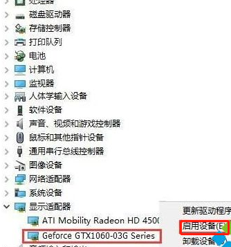 5.最后是手動啟動獨立顯卡,右鍵單擊獨立顯卡,選擇【啟用設備】即可。