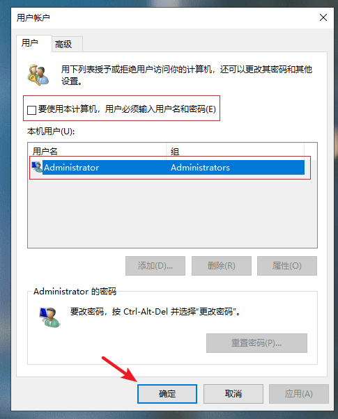 2.在彈出的用戶賬戶的窗口中,點擊要自動登錄的賬戶,然后取消【要使用本計算機,用戶必須輸入用戶名和密碼】前面的勾選,點擊【確定】。