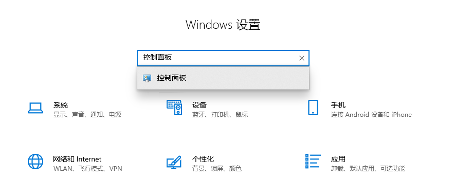 1.在鍵盤上按下【win+i】組合鍵,調出設置選項界面,然后在上方的搜索框內輸入【控制面板】,點擊進去。