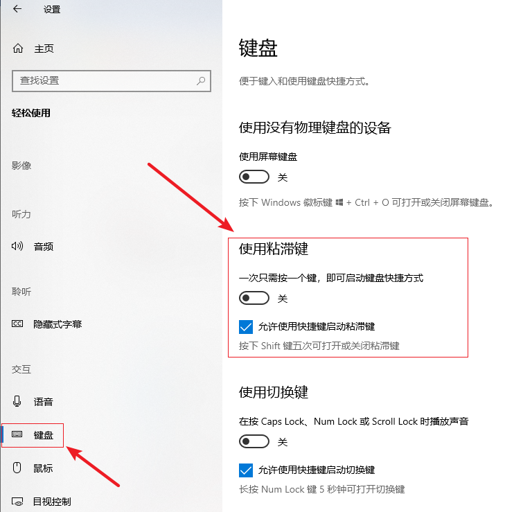 2.進入后,在左側下拉找到【鍵盤】,然后在右側把【使用粘滯鍵】的開關關閉即可。
