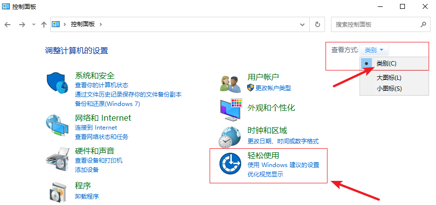 2.在控制面板界面中,在右上角的查看方式中選擇【類別】,接著點擊【輕松使用】。