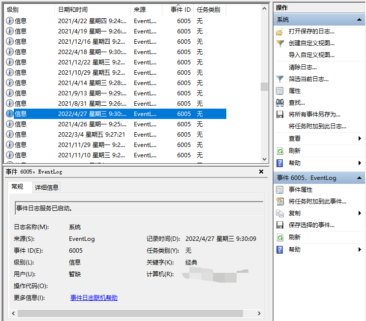 3.然后在右側就可以查看使用記錄了,其中ID為6005即為開機信息 6006為關機信息。