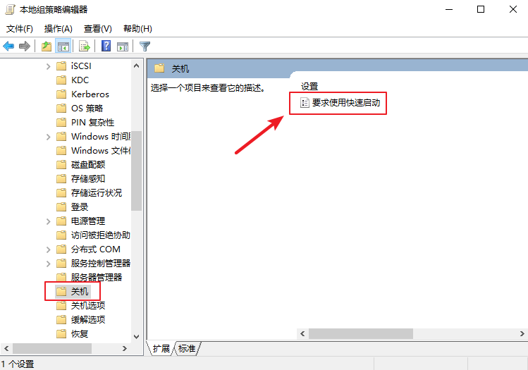 2.進入后,在左側依次點開【管理模板】-【系統】-【關機】,然后在右側雙擊點開【要求使用快速啟動】。