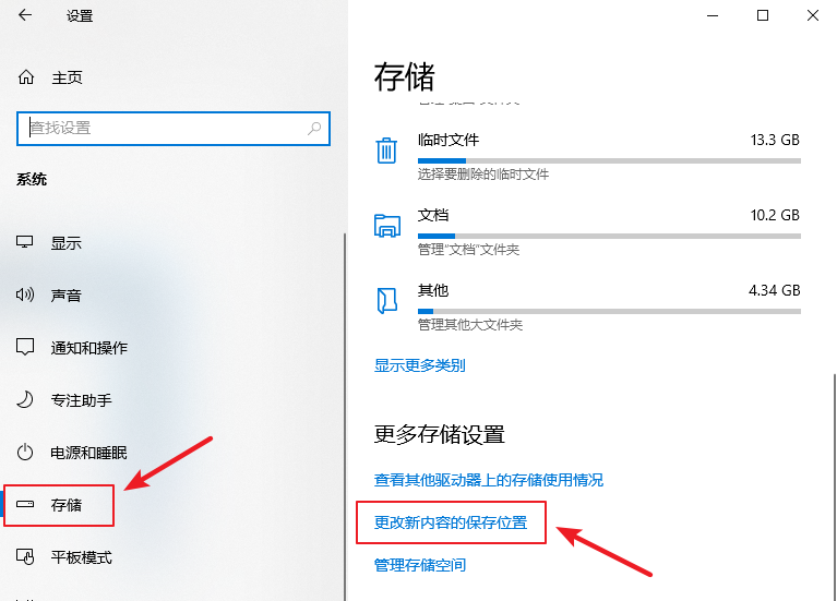 2.進入后,在左側選擇【存儲】,然后在右側下拉找到并點擊【更改新內容的保存位置】。