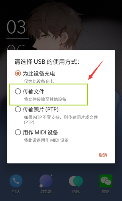 5. 把下載好驅(qū)動精靈萬能網(wǎng)卡版的手機(jī),用數(shù)據(jù)線鏈接到電腦上,手機(jī)彈出下面提示,選擇“傳輸文件”進(jìn)入(如果沒有點(diǎn)傳輸文件是沒辦法用電腦打開手機(jī)磁盤的)