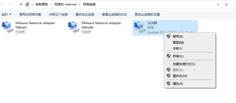 第五步- 右擊 正常使用的網絡設配器(小編目前是在使用網線,而另外兩個是虛擬機的虛擬網卡,所以就是右擊第三個),點擊屬性