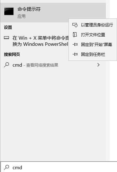第十五步- 點擊 ‘開始菜單’ ,輸入‘cmd(命令提示符)’ ,右擊 ‘命令提示符‘ ,點擊 ‘以管理員身份進行運行’