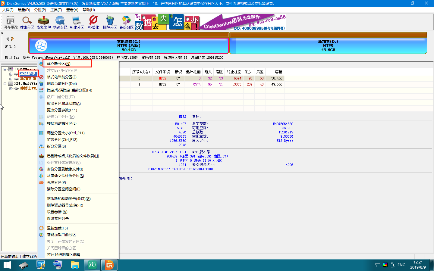 2.在“分區工具”界面中選擇需要分區的磁盤,這里以系統盤為例,右鍵選擇“建立新分區”,點擊“開始”,等待分區成功。