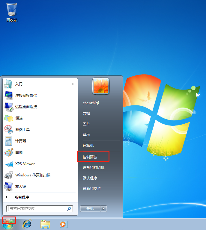 1.點(diǎn)擊win7桌面“開始菜單”圖標(biāo),隨后選擇“控制面板”進(jìn)入;