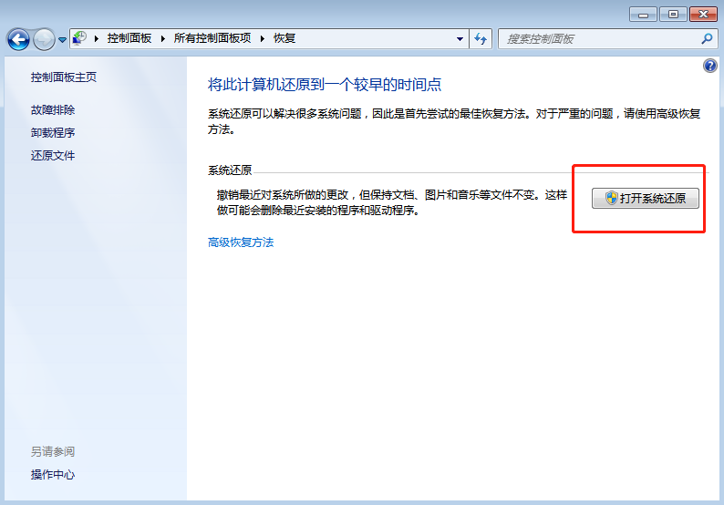 5.選擇“打開系統(tǒng)還原”,如下圖所示: