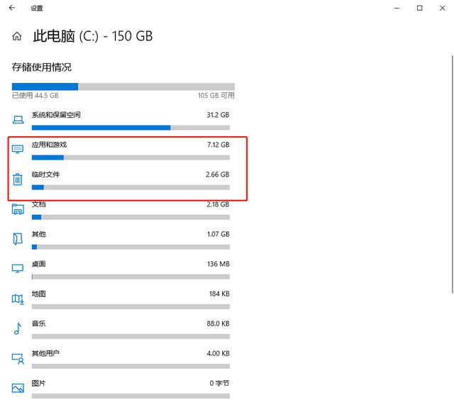 2.此時電腦會跟手機一樣顯示出電腦的存儲空間信息,我們可以在“臨時文件”和“應用和游戲”中刪除無用文件,釋放存儲空間。