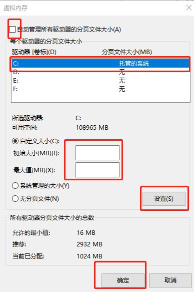 2.在以下窗口中取消勾選“自動管理分頁文件大小”復選框,如下圖所示。將空間設置好大小后點擊“設置”并“確定”,最后重啟電腦就可以完成虛擬內存的轉移了。