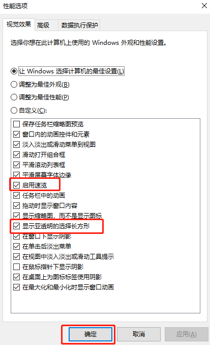 4.在性能選項窗口中取消“顯示亞透明的選擇長方形”和“啟用速覽”復選框,最后點擊“確定”。