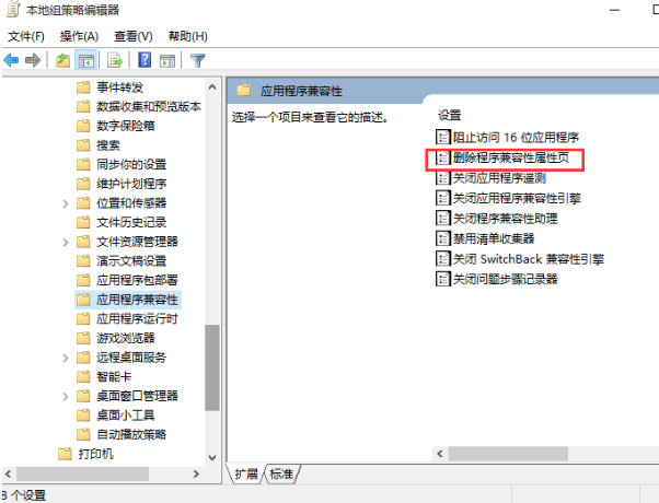 2.在打開的界面中依次找到:計算機配置-管理模板-windows組件-應用程序兼容性,隨后在右側雙擊打開“刪除程序兼容性屬性頁”。