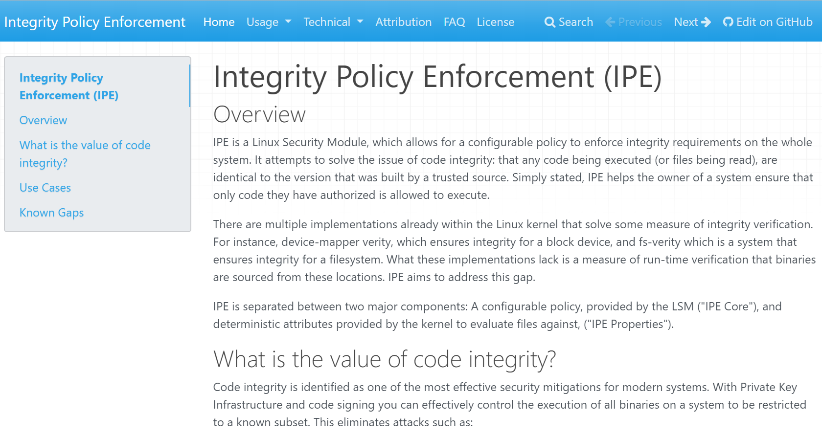 IPE?是微軟為解決 Linux 的代碼完整性問題而進行的嘗試。分為兩個主要部分:由 LSM 提供的可配置策略(“IPE Core”),以及由內(nèi)核提供的用于評估文件的確定性屬性(“IPE Properties”)。目前,IPE?尚處于?RFC(request for comments)狀態(tài)。