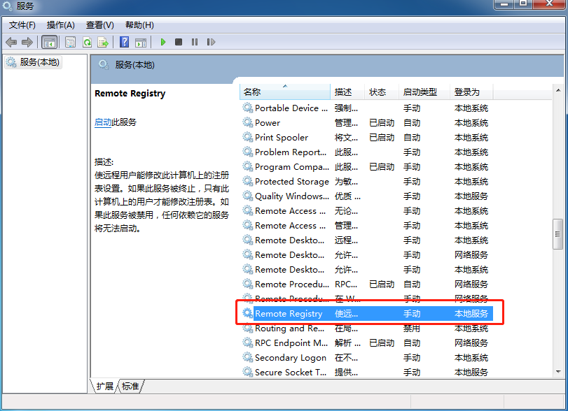 2.開始找到并打開“remote registry”選項(xiàng),如下圖所示: