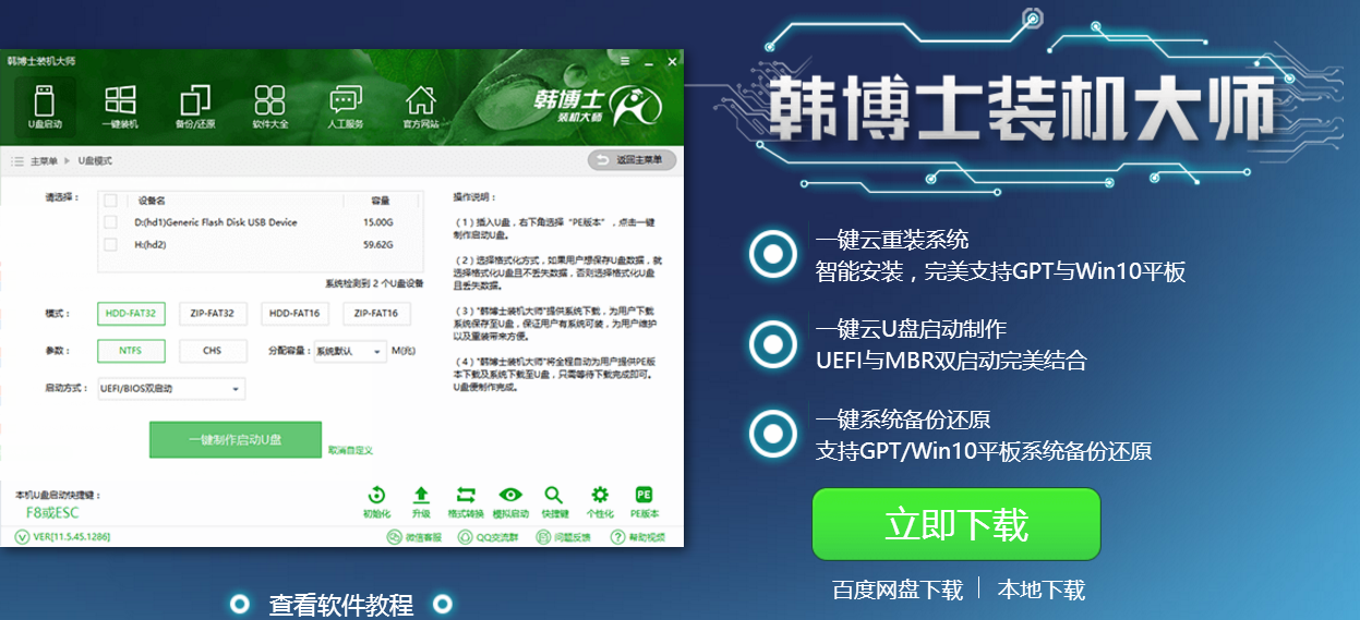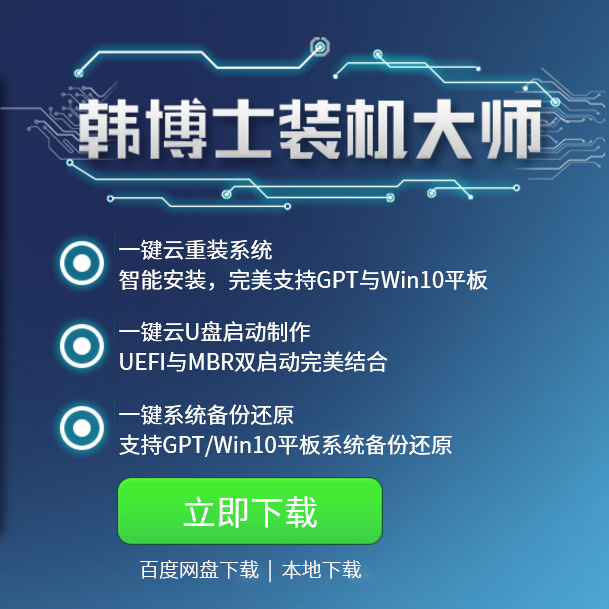 韓博士U盤啟動盤制作|U盤重裝win10系統圖文教程比起傳統的在線一鍵重裝,越來越多的人更加喜歡用U盤重裝系統。要使用U盤重裝系統,自然要制作啟動U盤。韓博士裝機大師就有U盤重裝功能。下面就讓小編給大家帶來韓博士U盤重裝win10系統圖文教程。