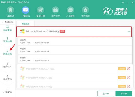3.進入“選擇系統”界面后,您可以看到不同版本的win10系統,選擇最適合您的版本,點擊“下一步”開始安裝。