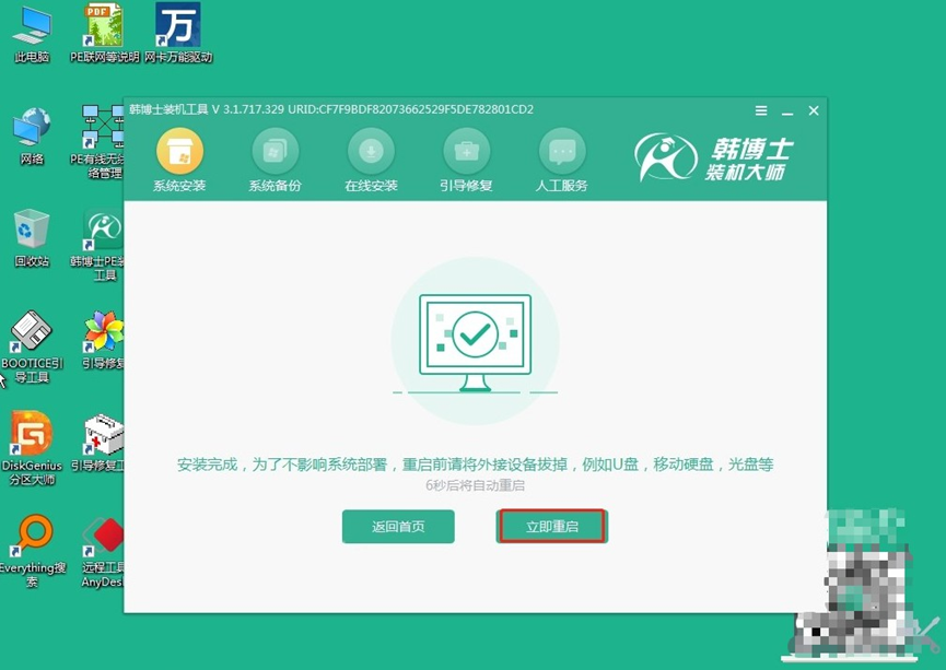5.系統正在安裝中,為確保安裝順利完成,請暫時避免進行其他操作。安裝完成后,點擊“立即重啟”以啟動新系統。