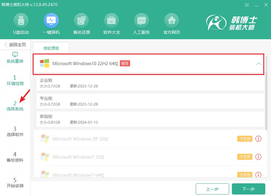 3.進入“選擇系統”界面后,您可以看到不同版本的win10系統,選擇最適合您的版本,點擊“下一步”開始安裝。
