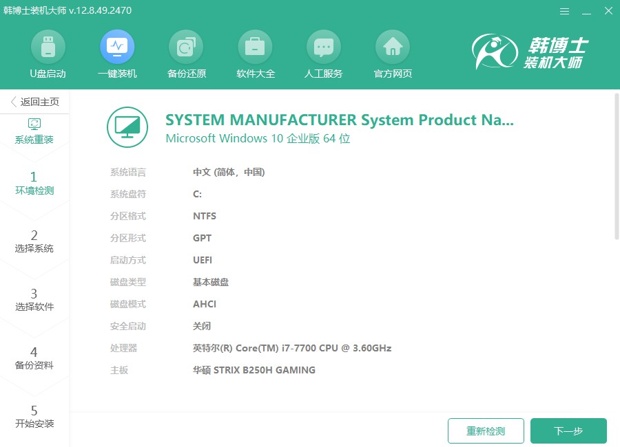 1.打開韓博士官網,下載裝機大師安裝程序,完成安裝后啟動軟件,在界面上選擇“開始重裝”,然后按照提示操作。