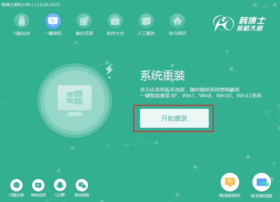 1.首先到韓博士官網下載裝機大師軟件,安裝完后直接打開,在首頁選擇“開始重裝”。