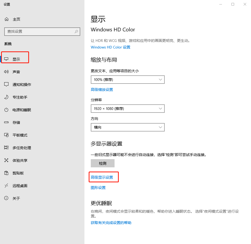 2.在“顯示”下選擇“高級顯示設置”進入。