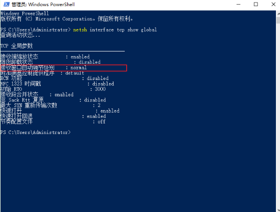 3.電腦開始顯示TCP的全局參數,可以看到接收窗口自動調節級別為normal。