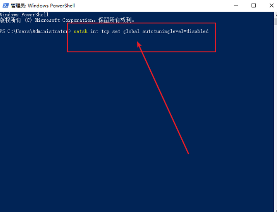 4.繼續輸入命令回車:netsh int tcp set global autotuninglevel=disabled