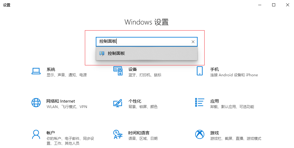 1.在鍵盤上按下【win+i】組合鍵,調(diào)出設(shè)置選項界面,然后在上方搜索欄輸入【控制面板】,點擊進入。