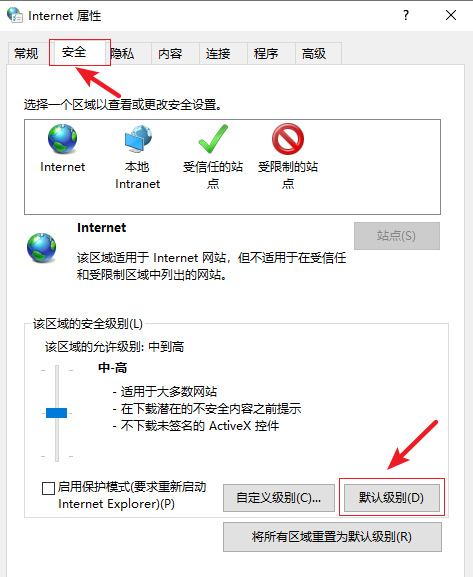 3.進入Internet屬性界面,在上方切換到【安全】選項,然后點擊【默認(rèn)級別】。