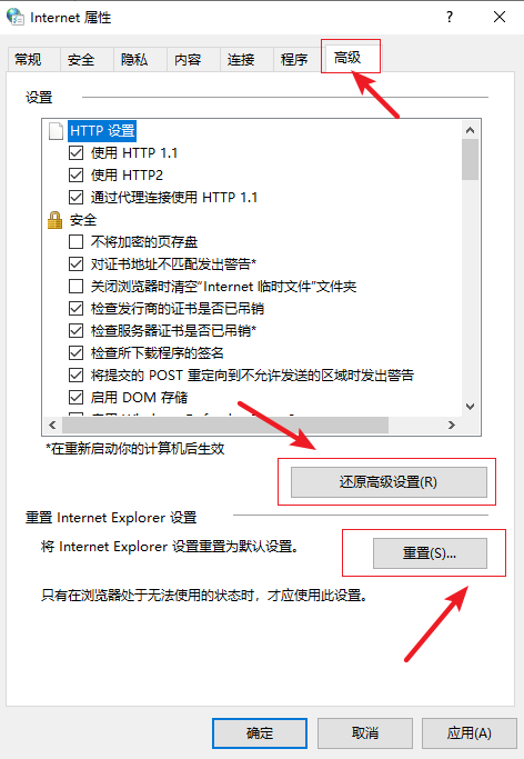 4.接著切換到【高級】選項卡,點擊【還原高級設(shè)置】-【重置】。