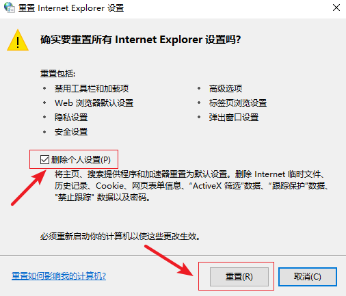 5.進入以下界面,勾選【刪除個性化設(shè)置】,最后點擊【重置】按鈕即可。