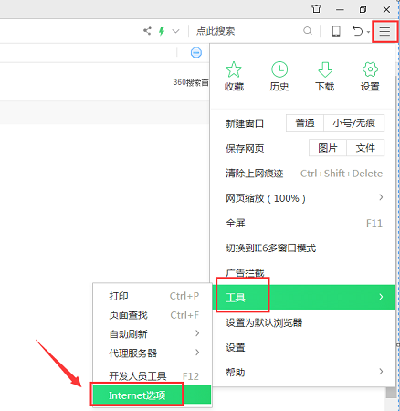 1.打開瀏覽器(以360瀏覽器為例),選擇瀏覽器右上角“設(shè)置”的符號,接著點擊【工具】,選擇【Internet選項】。