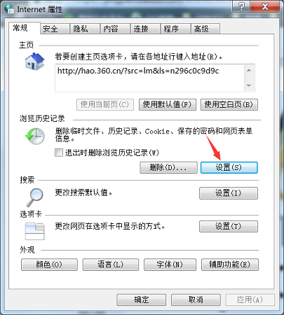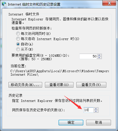 3.然后再點擊【設(shè)置】,在【網(wǎng)頁保存在歷史記錄中的天數(shù)】那改為10天,防止內(nèi)存滿了,最近點擊【確定】即可,這樣再重新打開網(wǎng)頁就完整了。