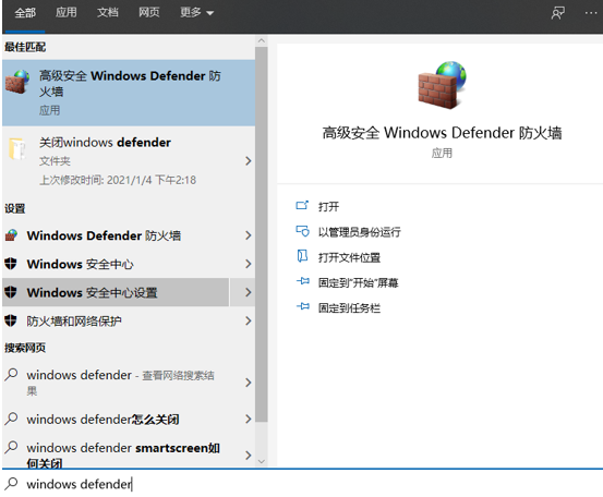 在搜索框輸入【windows defender】,點(diǎn)擊第一個【windows defener安全中心】進(jìn)行全方面檢查。